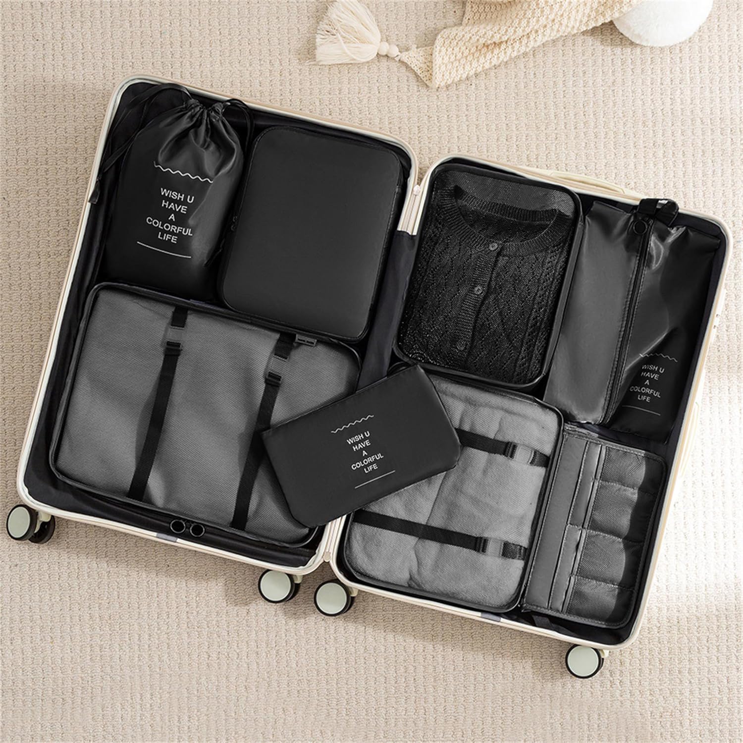 Introducing the UNGGJKB Travel Accessory Organizer, a must-have for any savvy traveler looking to stay organized on the go. This 8-piece set of packing cubes is designed to streamline your packing process and keep your suitcase tidy throughout your journey.